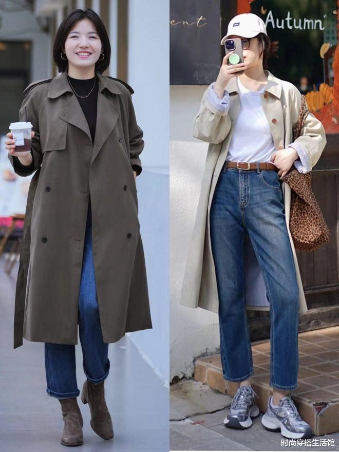 其次穿风衣我们还可以选择搭配牛仔裤,毕竟牛仔裤是裤子中的“常青树”,而且风衣的随性和大气,两者结合在一起的话会更加的休闲和惬意,轻松就穿出画时髦和优雅感,此外我们选择穿九分牛仔裤,脚上搭配上乐福鞋、老爹鞋轻松就可以拉长腿部线条,从而显高显腿长。